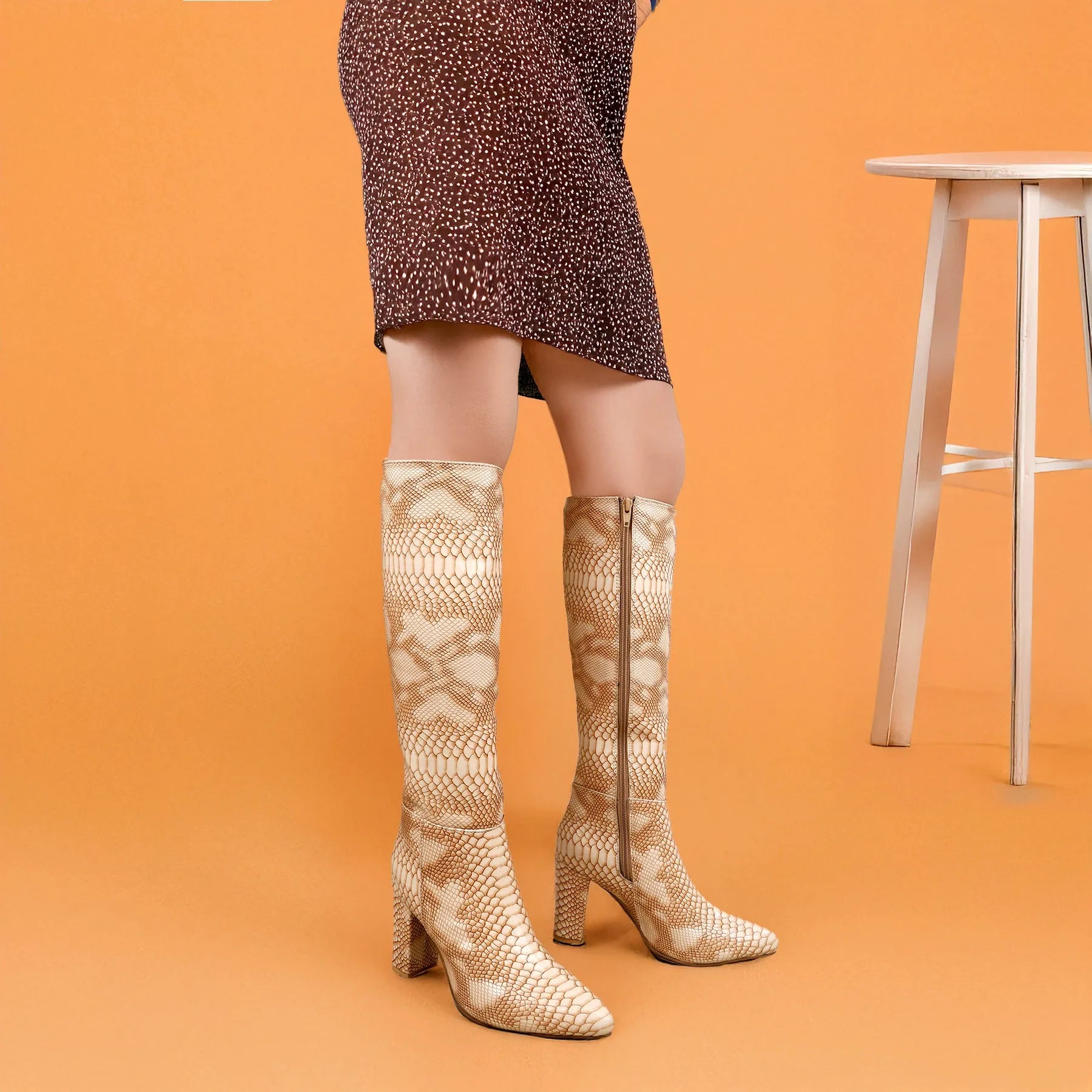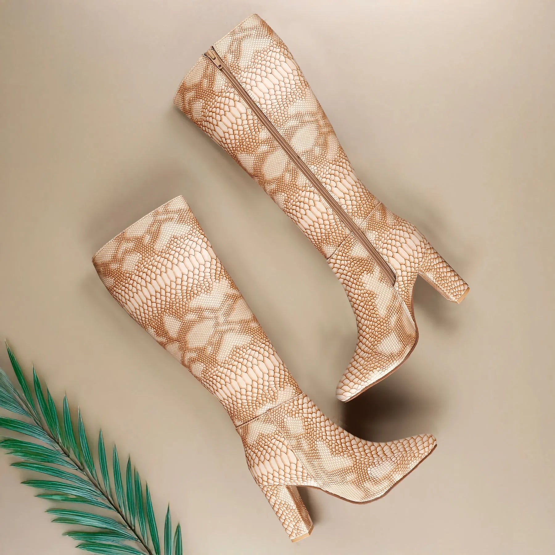 Unleash Your Bold Side: The Luxe Faux-Snake Knee-High Boots in Black Gloss
