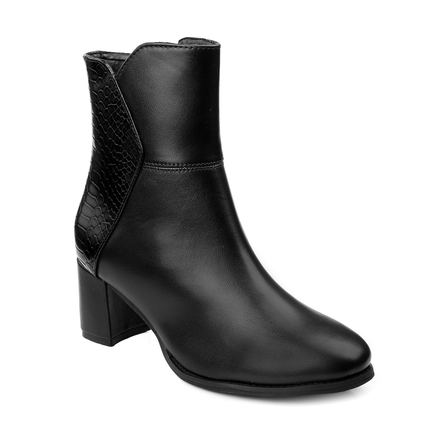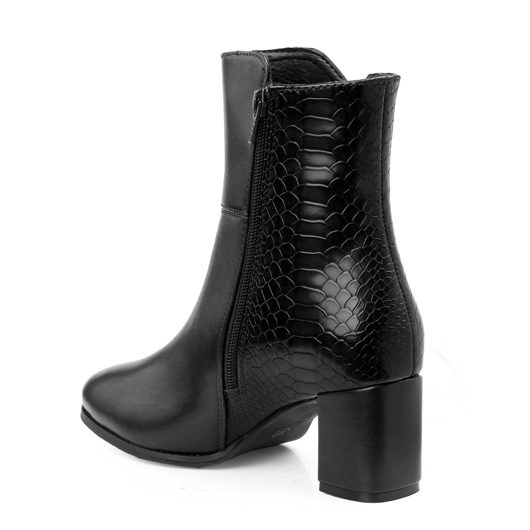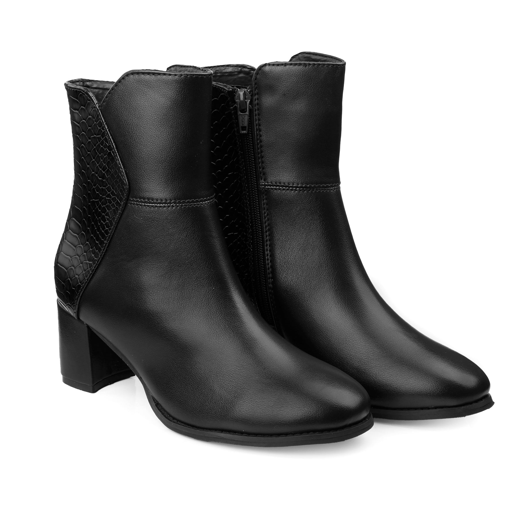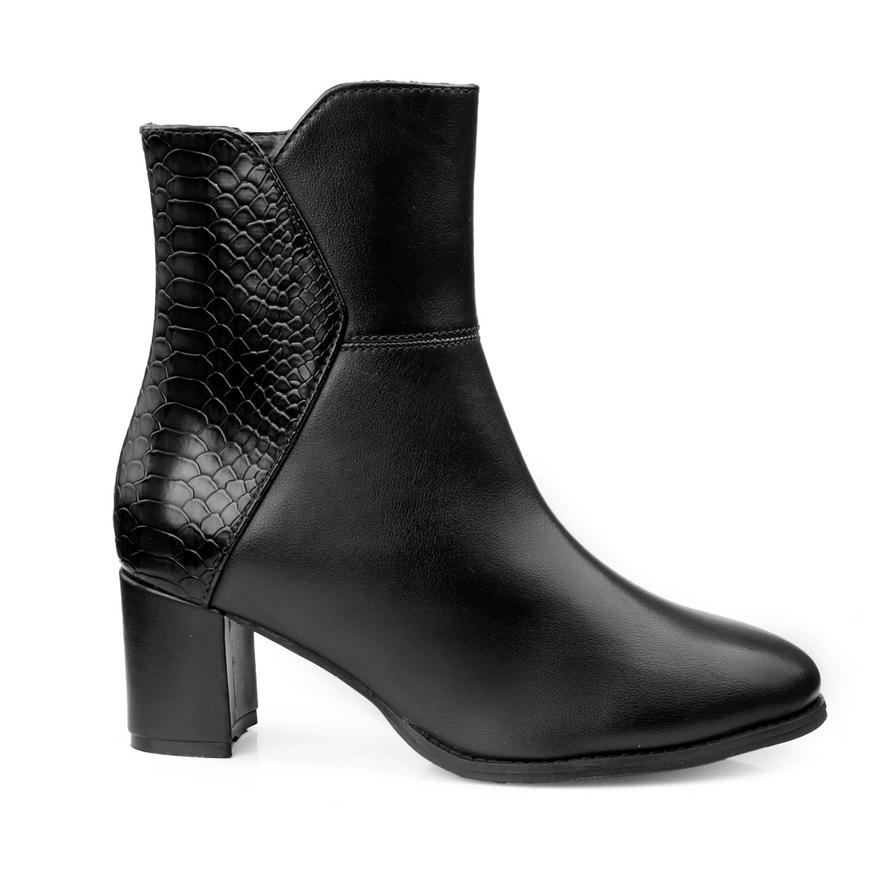 These exquisite ankle boots are designed to combine sophistication, style and comfort. Made from high-quality faux leather, they feature a smooth, polished finish on the front and sides, giving them a sleek and refined appearance. The rear section of the boots is adorned with a crocodile-textured pattern, adding a touch of luxury and uniqueness to the design.