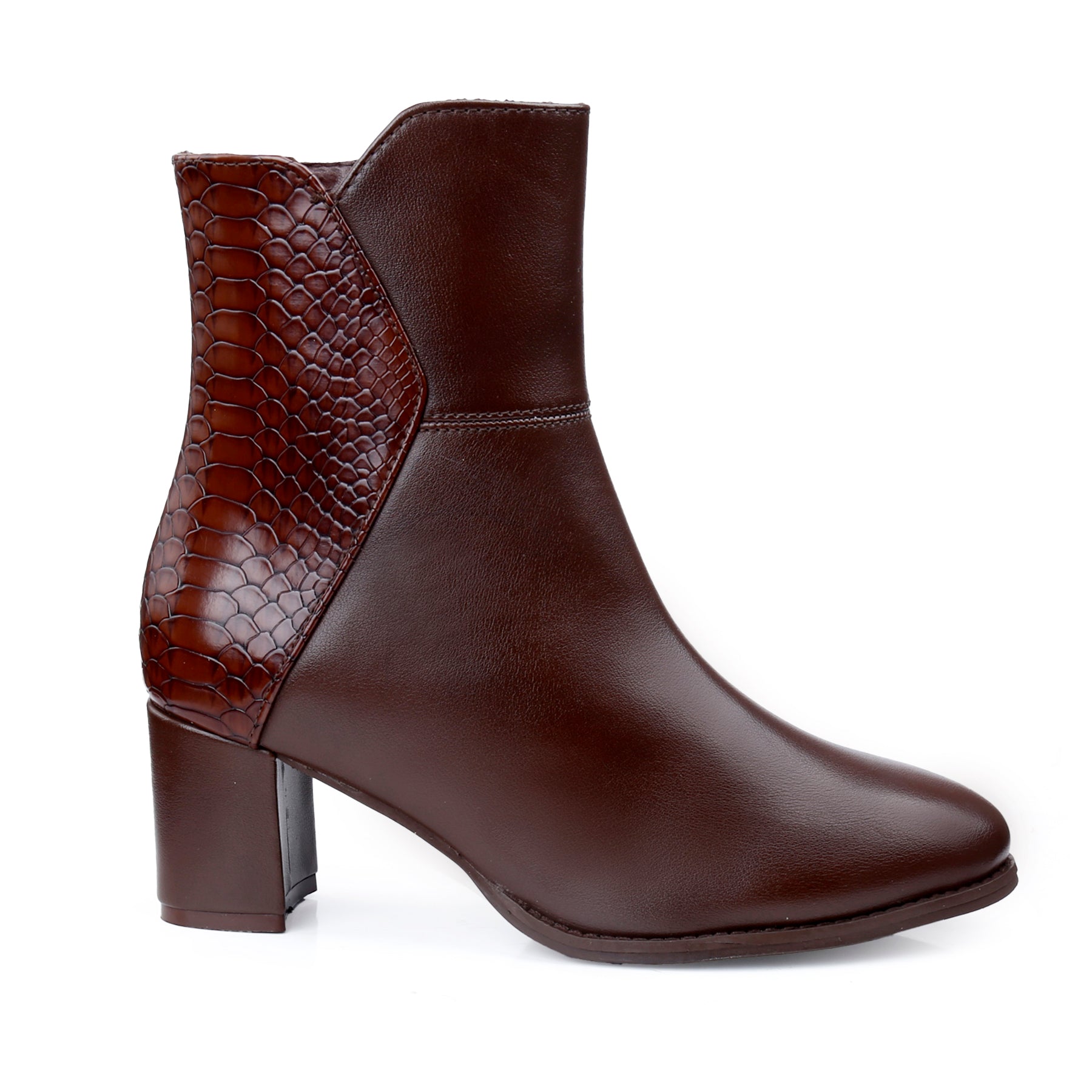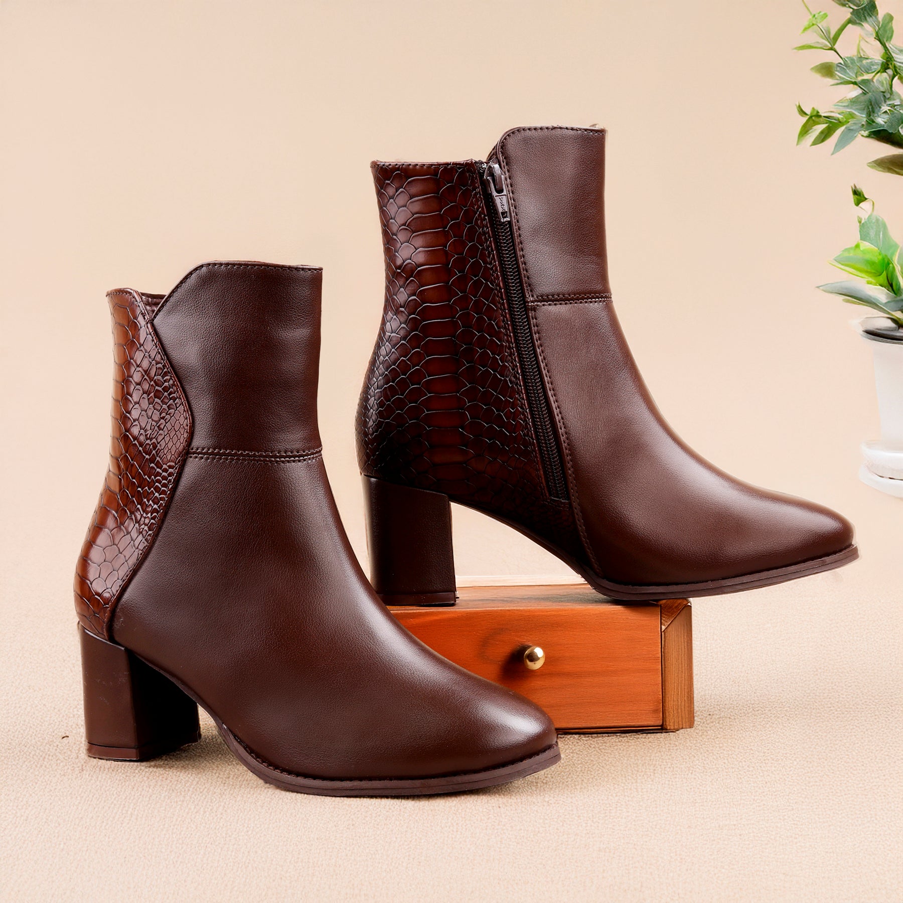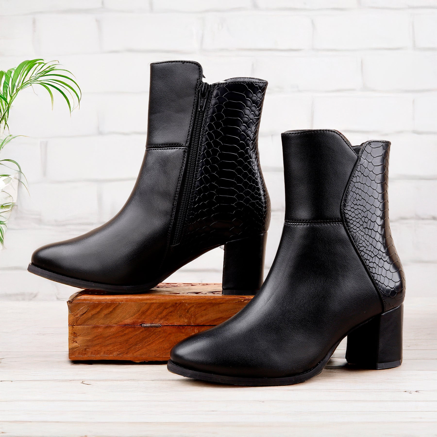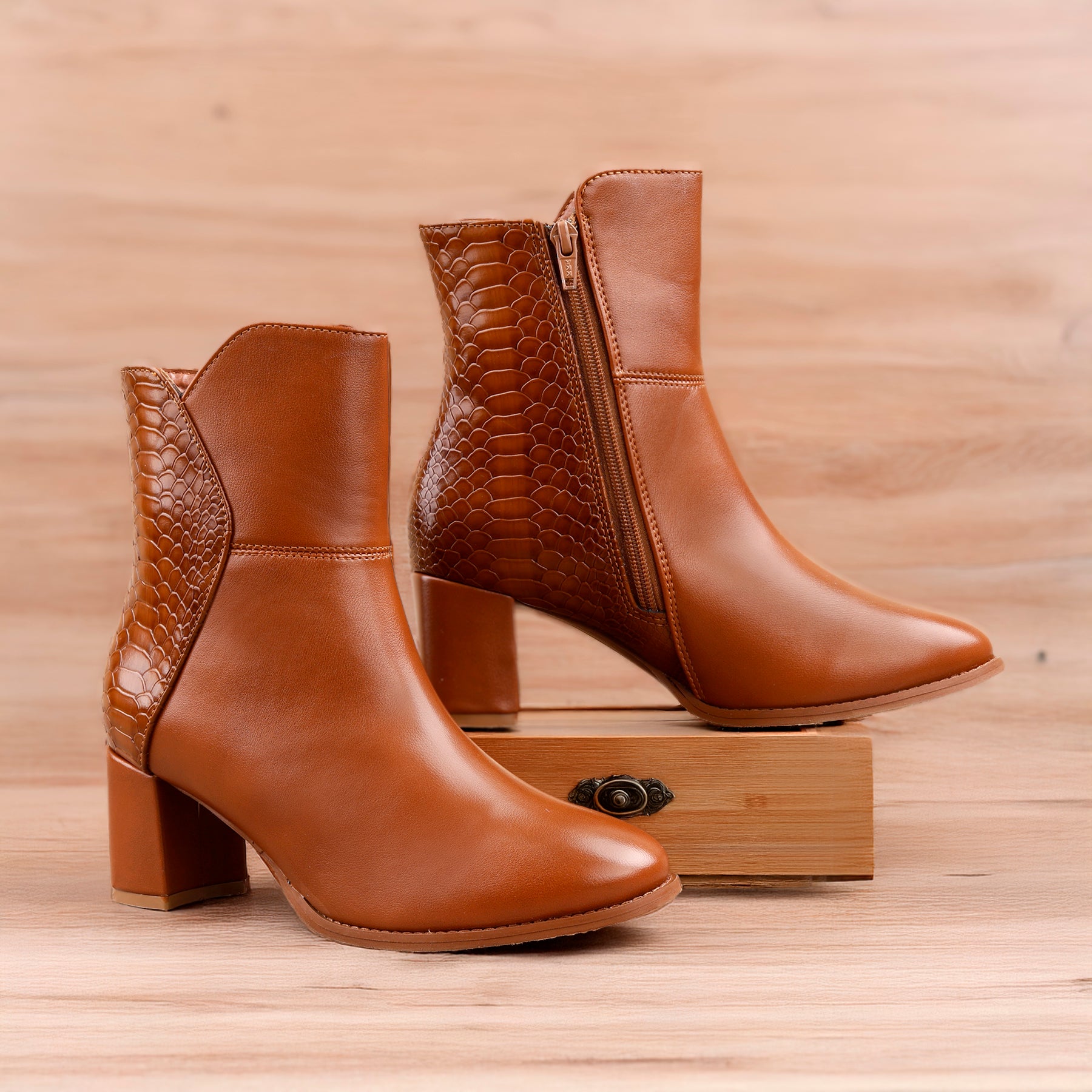 These exquisite ankle boots are designed to combine sophistication, style and comfort. Made from high-quality faux leather, they feature a smooth, polished finish on the front and sides, giving them a sleek and refined appearance. The rear section of the boots is adorned with a crocodile-textured pattern, adding a touch of luxury and uniqueness to the design.