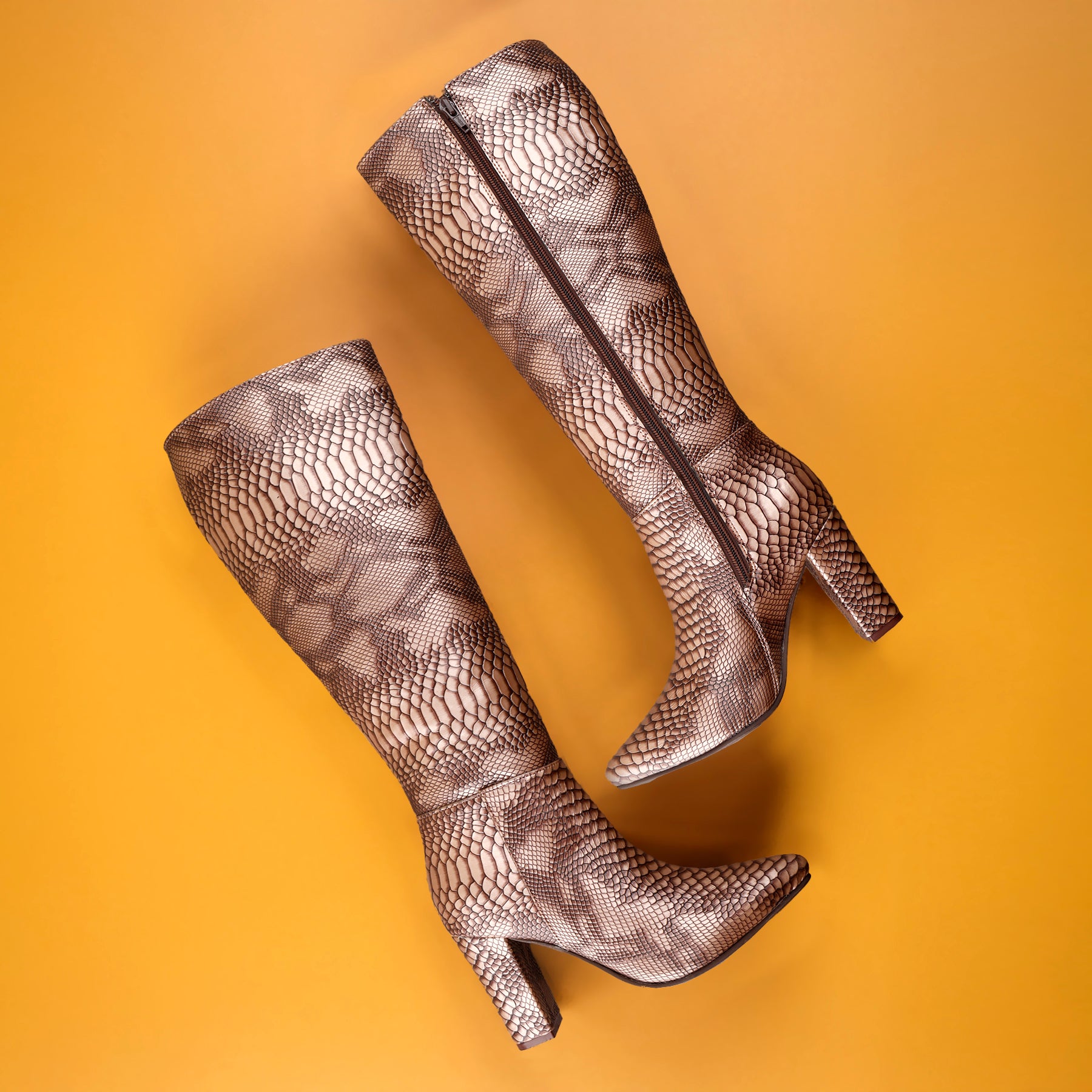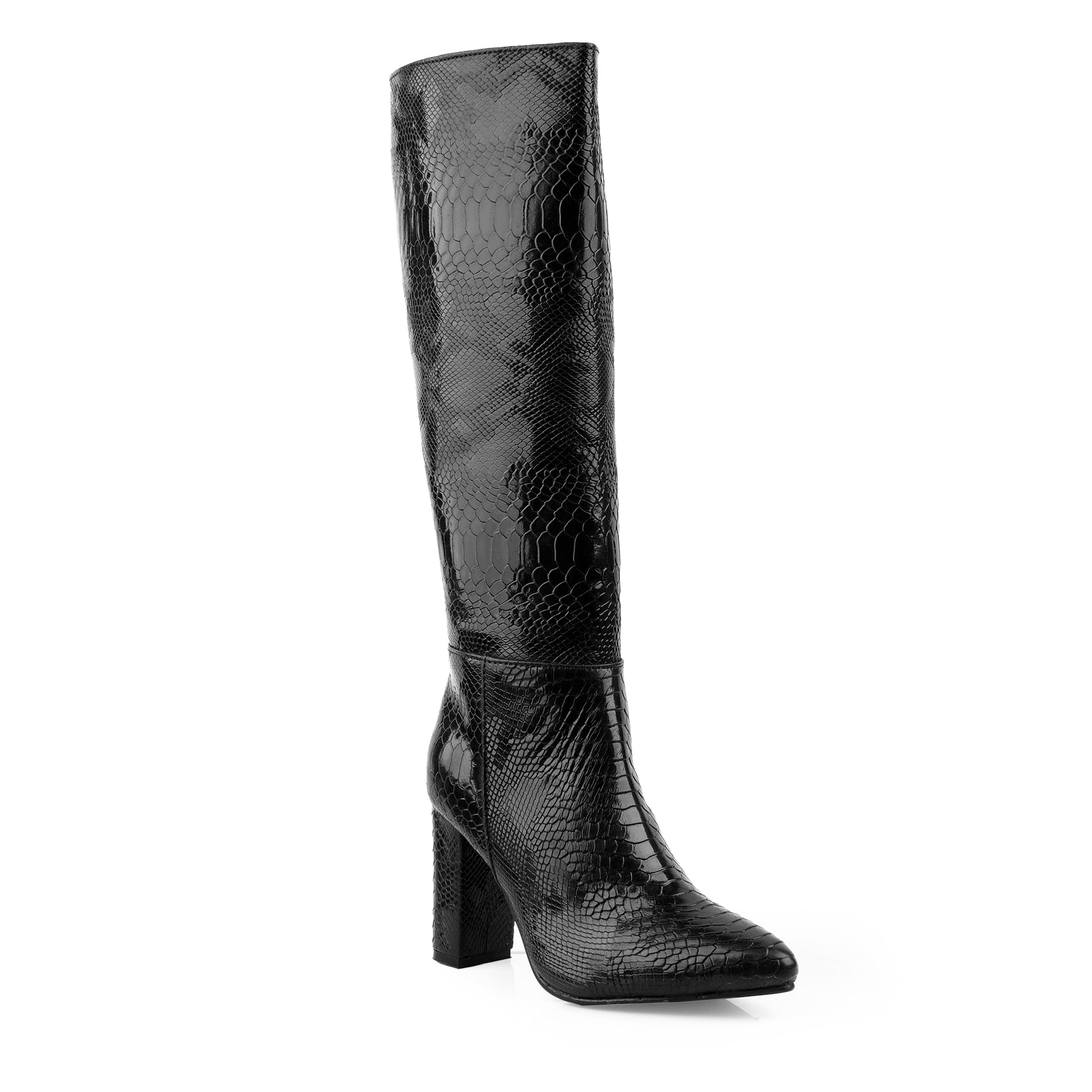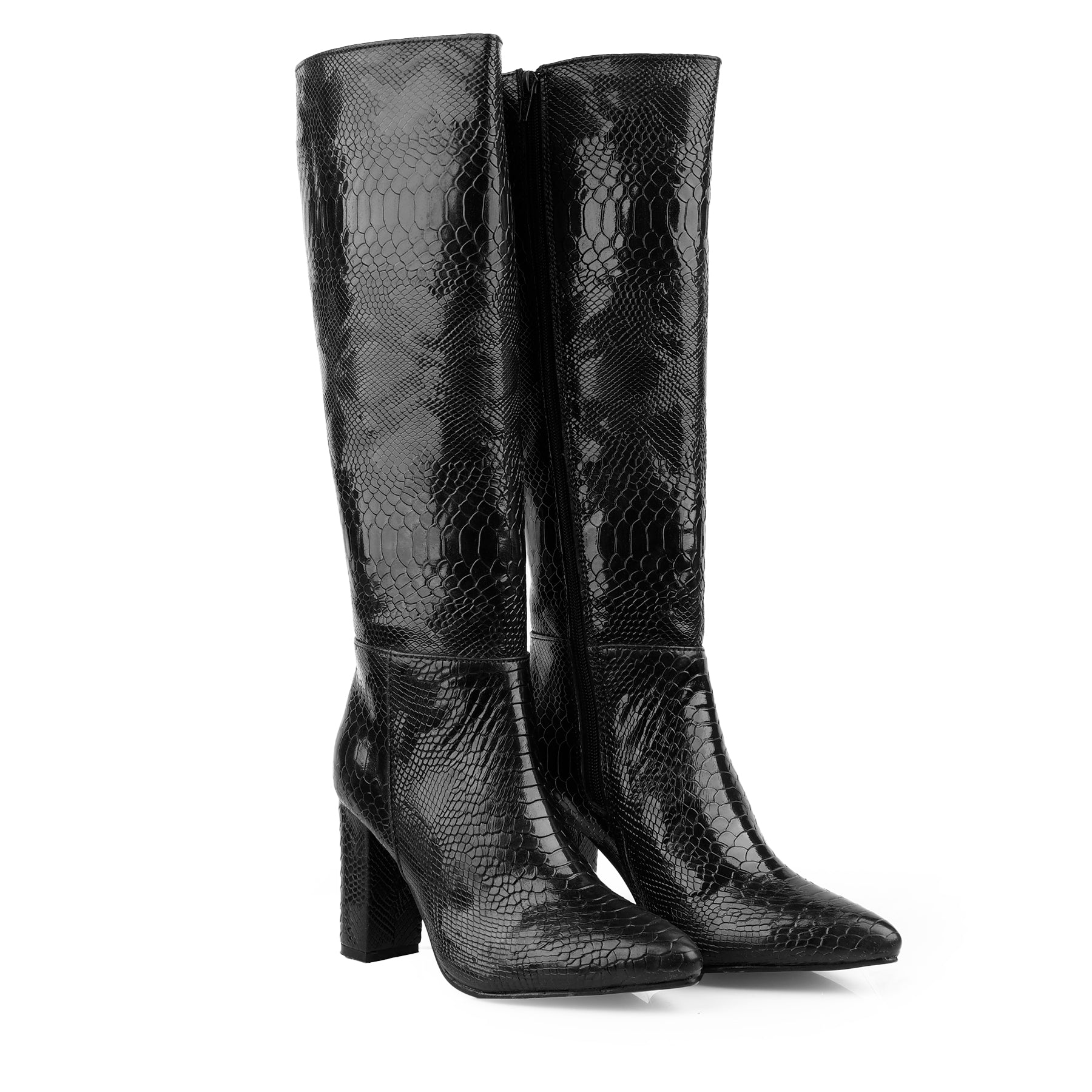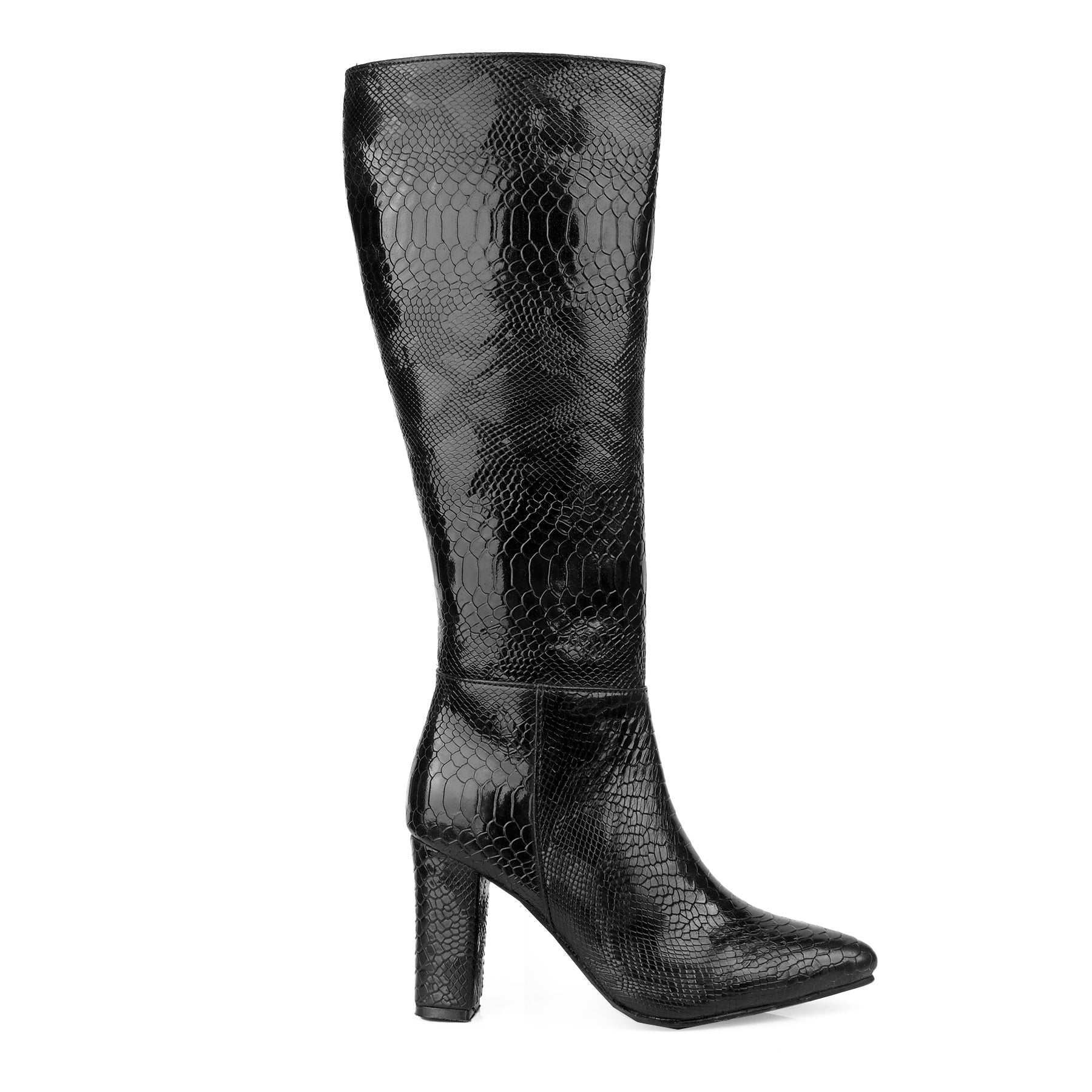 Unleash your inner bold with these statement-making knee-high boots in a luxe faux snake texture. Featuring a sleek glossy black finish, a pointed toe, and a block heel for stable elevation — these boots blend elegance and edge with every step. Whether you're dressing up for a night out or elevating your casual look, these boots are your new go-to power piece.