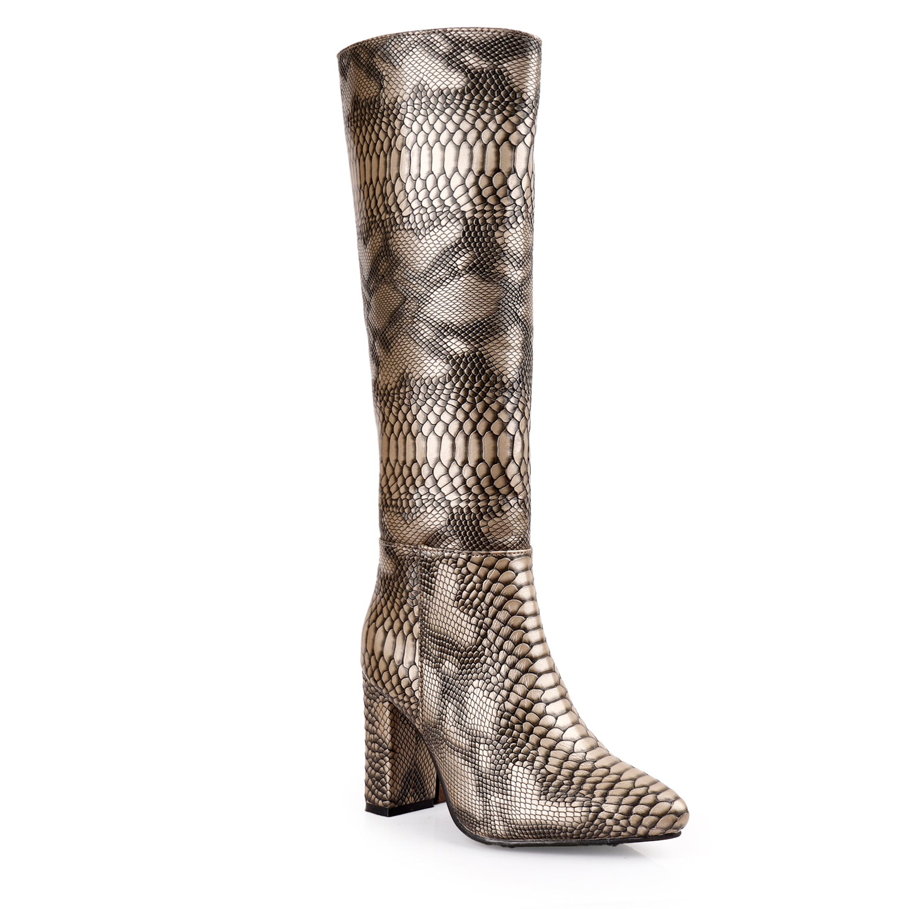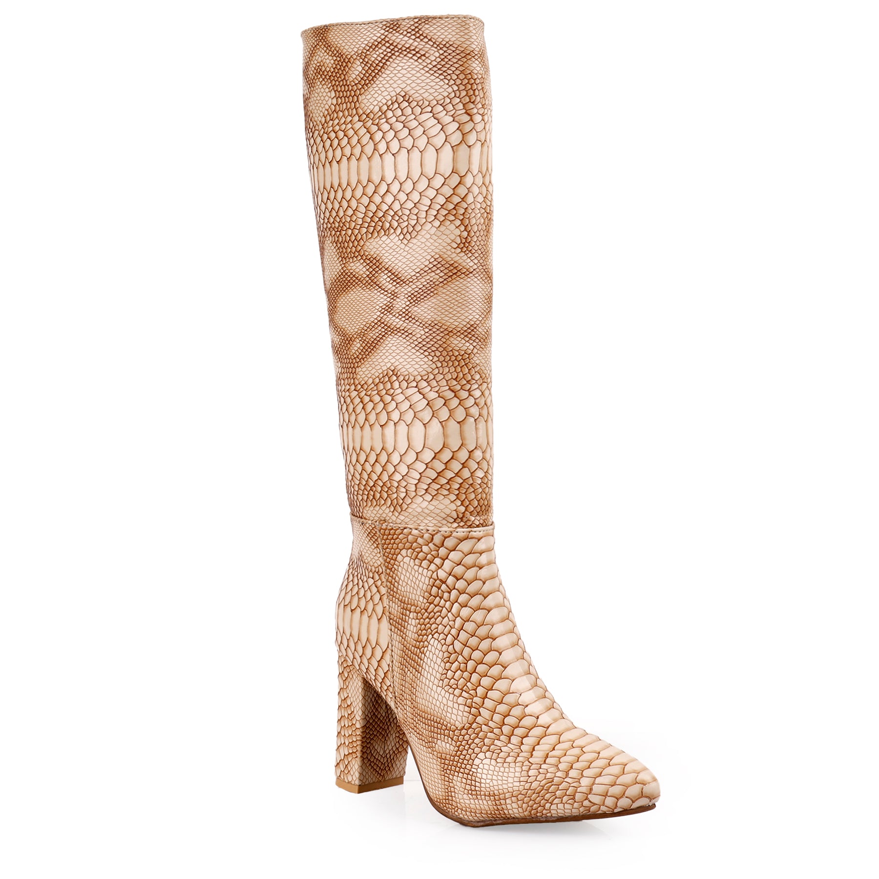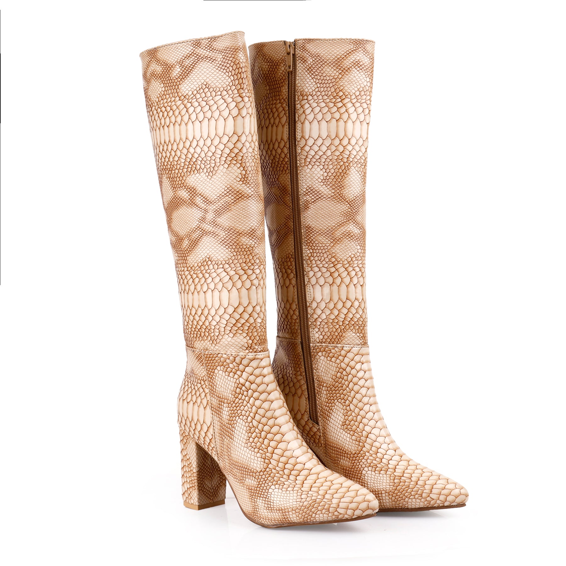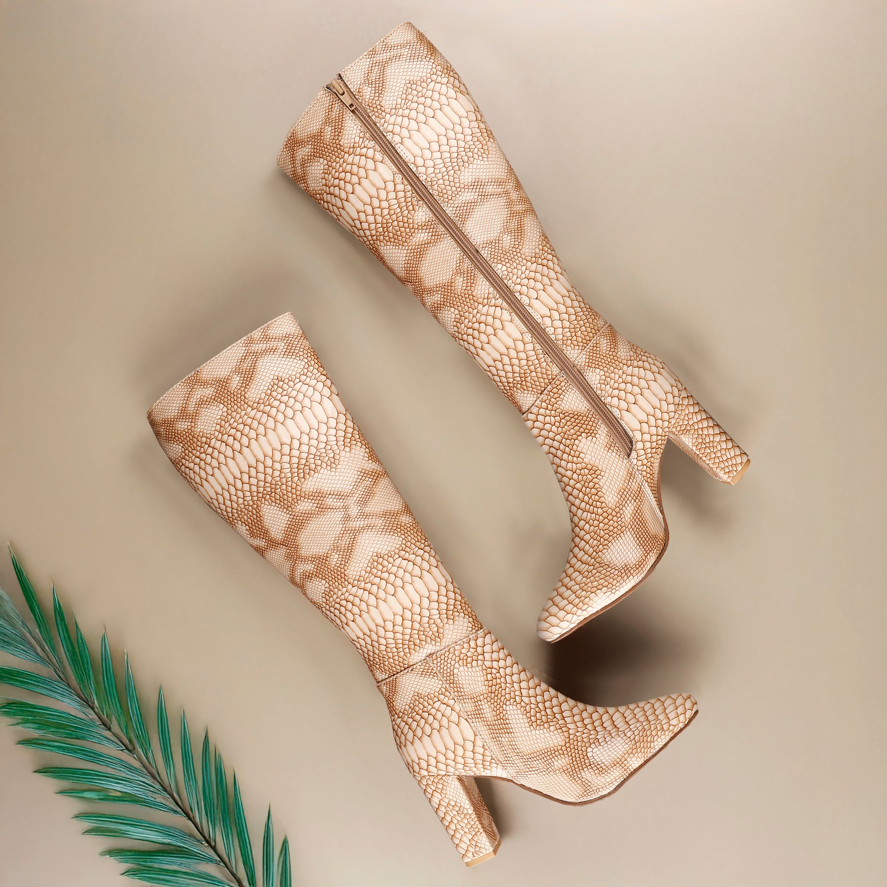 Unleash your inner bold with these statement-making knee-high boots in a luxe faux snake texture. Featuring a sleek glossy black finish, a pointed toe, and a block heel for stable elevation — these boots blend elegance and edge with every step. Whether you're dressing up for a night out or elevating your casual look, these boots are your new go-to power piece.