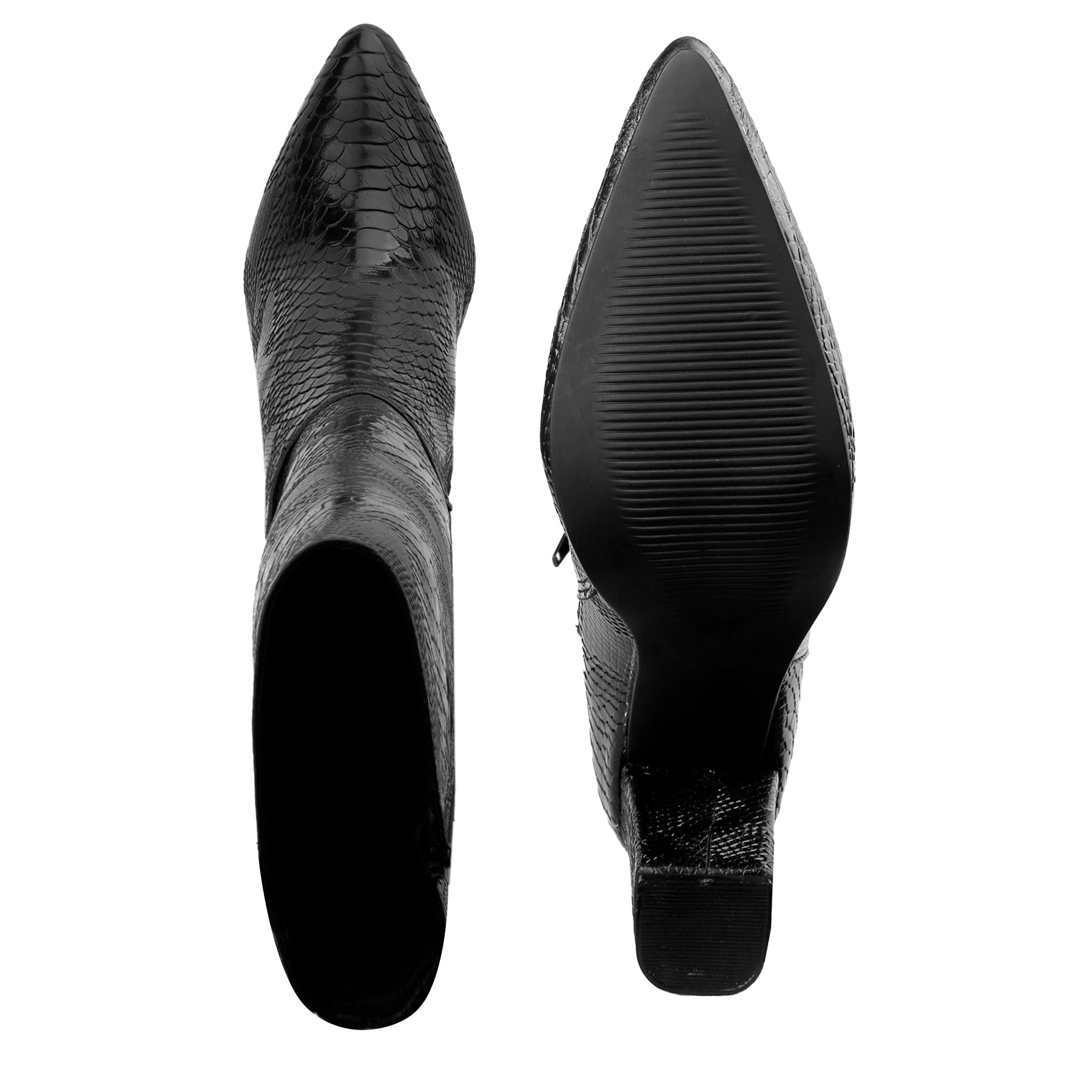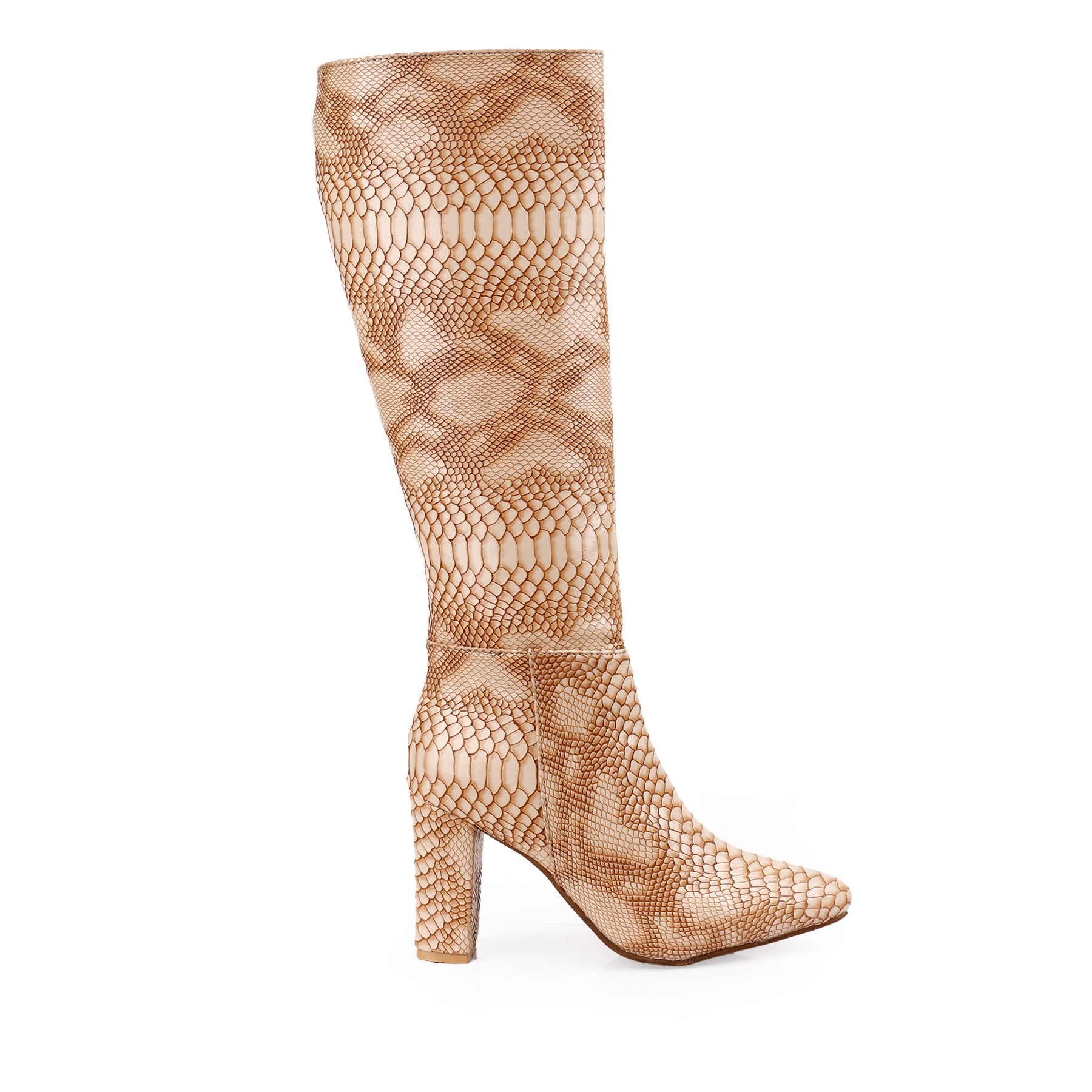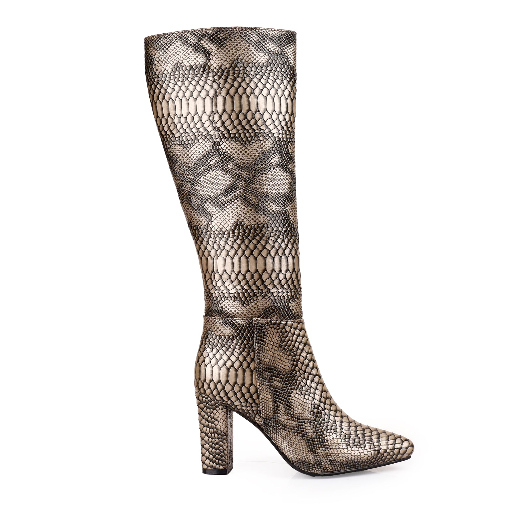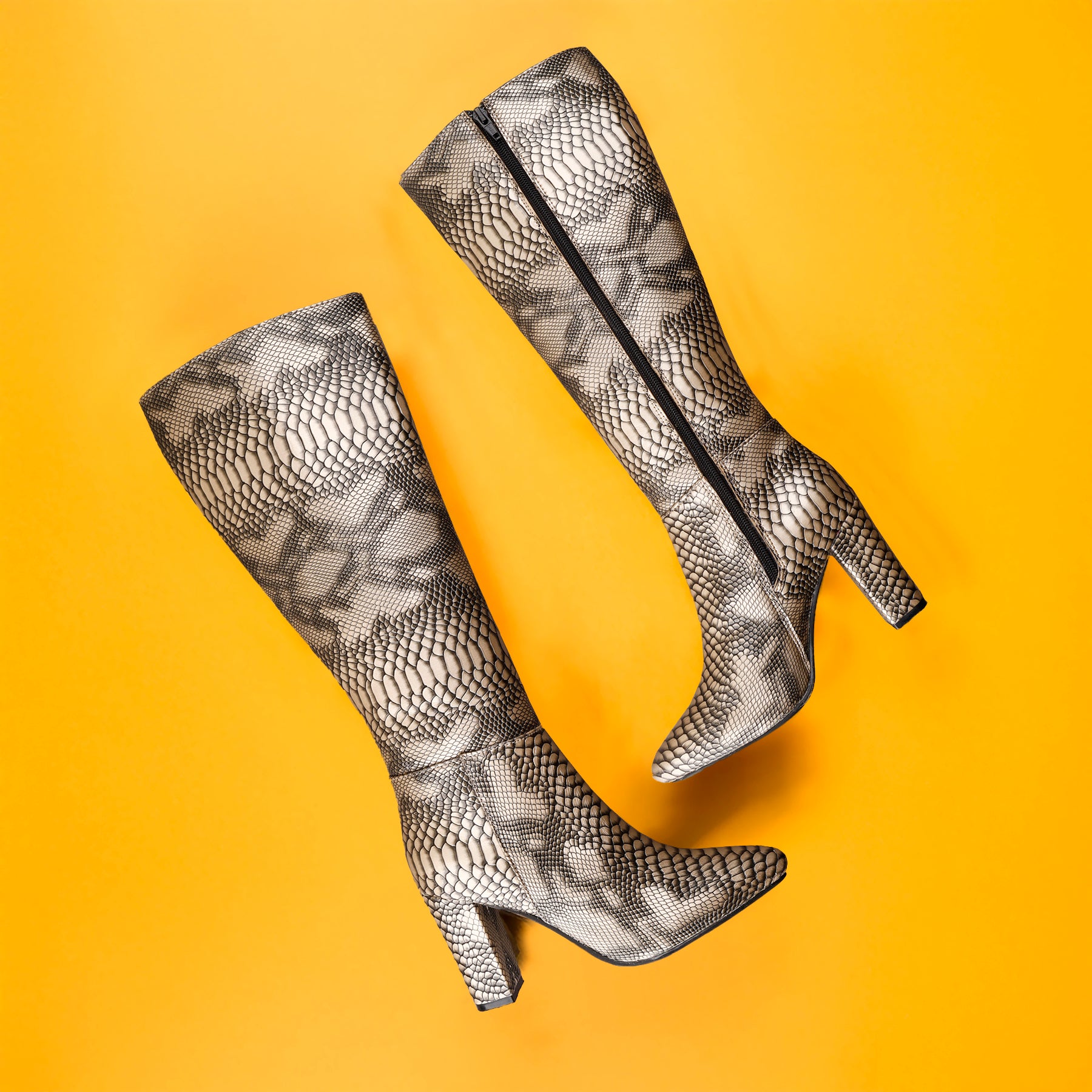 Unleash your inner bold with these statement-making knee-high boots in a luxe faux snake texture. Featuring a sleek glossy black finish, a pointed toe, and a block heel for stable elevation — these boots blend elegance and edge with every step. Whether you're dressing up for a night out or elevating your casual look, these boots are your new go-to power piece.